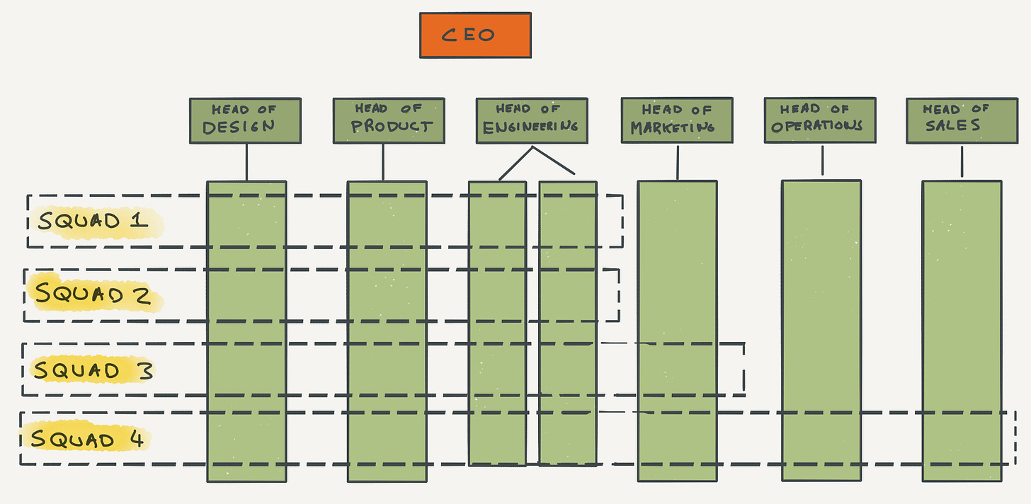 Having set up your organization functionally, you can now generally ignore that structure and should run most of your product efforts using cross-functional teams slicing across your org chart. People will naturally bias towards their function and manager, so the company rhythm should orient as much as possible around the cross-functional teams (often referred to as squads, pods, or cells) that are solving key problems of the company. So, for example, this means that squads should be the ones demoing progress at every company all-hands and celebrating success as features ship.